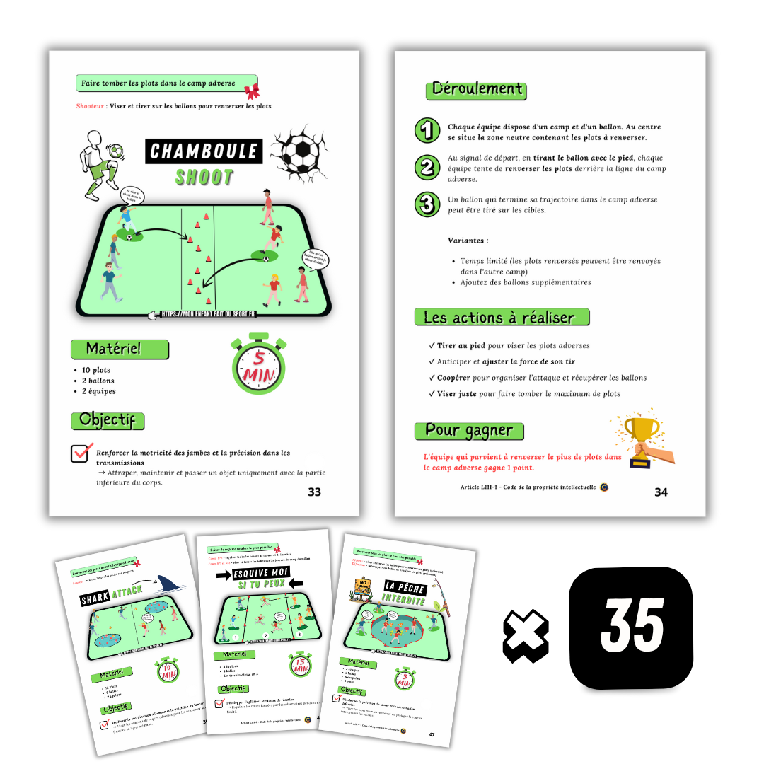• 35 Fiches de Jeux de Ballon : Des situations variées (adresse, esquive, jeux collectifs) prêtes à l'emploi (format A4).